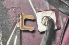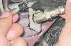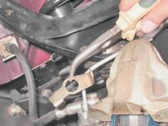 Шланг тормозного механизма переднего колеса - заменаРабота показана на примере замены шланга тормозного механизма правого колеса. Для выполнения работы потребуется помощник, а также специальный ключ на 10 мм для тормозных трубок, прозрачная виниловая трубка подходящего диаметра, емкость для слива тормозной жидкости, свежая тормозная жидкость (см. "Приложения"). Снятие 1. Подготавливаем автомобиль к выполнению операций (см. "Подготовка автомобиля к TO и ремонту"). 2. Снимаем переднее колесо (см. "Колесо - замена"). 3. Пассатижами извлекаем скобу, фиксирующую тормозной шланг.