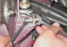 6. Торцовым ключом с глубокой головкой на 10 мм отворачиваем болт крепления фиксирующей скобы тормозного шланга.