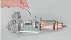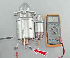 4. Для проверки обмоток якоря и статора снимаем заднюю крышку стартера и отсоединяем щеточный узел (см. ниже, "Ремонт"). 5. Подсоединив один щуп омметра к корпусу, другой попеременно подсоединяем к выводам обмоток статора, проверяя отсутствие их замыкания на корпус.