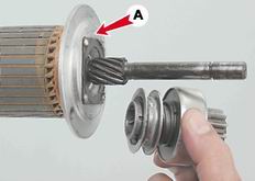 14. Снимаем с вала якоря ограничительное кольцо, обгонную муфту с шестерней привода и перегородку корпуса A.