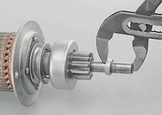 Сборка 1. Промываем детали стартера уайт-спиритом или керосином, продуваем сжатым воздухом. Проверяем состояние деталей. Крышки и корпус должны быть без трещин. Зубья шестерни не должны иметь значительного износа. Шестерня должна легко проворачиваться относительно ступицы только в одну сторону - в направлении вращения якоря. Ha поверхностях шлицов и цапф вала не должно быть задиров, забоин и следов износа. Ha рабочей поверхности коллектора не должно быть пригораний. Небольшие пригорания удаляем мелкозернистой наждачной бумагой. Щетки должны свободно перемещаться в пазах щеткодержателей. Щеткодержатели "положительных" щеток не должны иметь замыкания с "массой". Изношенные до высоты менее 12 мм щетки заменяем новыми. 2. Смазываем моторным маслом опорные поверхности и шлицы вала якоря, шлицы ступицы обгонной муфты, втулки подшипников в крышках стартера и ось рычага привода. Поводковое кольцо ступицы обгонной муфты смазываем пластичной смазкой. 3. Устанавливаем на вал якоря перегородку и обгонную муфту с шестерней привода. 4. Надеваем на вал ограничительное кольцо хода шестерни так, чтобы меньший диаметр внутренней конусной поверхности кольца был обращен в сторону шестерни. Устанавливаем в проточку вала стопорное кольцо, обжимаем его и напрессовываем на него раздвижными пассатижами ограничительное кольцо, при необходимости утапливая стопорное кольцо в проточку шлицевой отверткой.
