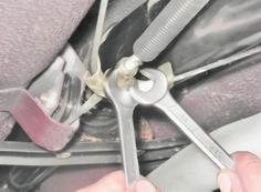5. Удерживая наконечник переднего троса пассатижами, ключом на 13 мм вращаем регулировочную гайку по часовой стрелке для увеличения натяжения троса или против - для уменьшения (см. ниже "Стояночная тормозная система - разборка и сборка"), добиваясь необходимого хода рычага привода стояночного тормоза.