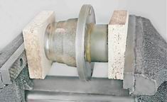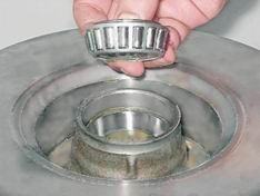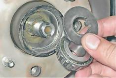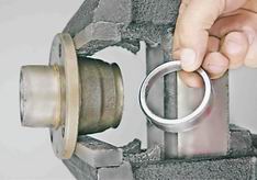 13. Повернув ступицу в тисках, аналогично выпрессовываем кольцо наружного подшипника. Сборка 1. Промываем все детали в керосине или уайт-спирите, на посадочные места подшипников ступицы наносим пластичную смазку. 2. Наружные кольца подшипников удобно запрессовывать в тисках, через деревянные прокладки, используя в качестве оправок кольца от старых подшипников, которые ориентируем меньшим диаметром конуса внутрь ступицы. Новые кольца в ступицу запрессовываем до упора.