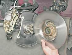 4. Потянув на себя, снимаем с цапфы поворотного кулака ступицу с тормозным диском.