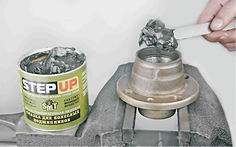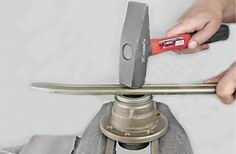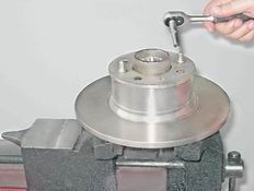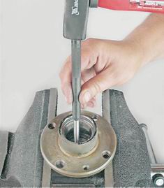11. Закрепляем ступицу в тисках. Наносим легкие удары молотком по кругу через выколотку по наружному кольцу внутреннего подшипника.