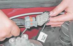 14. Нажав на пружинный фиксатор колодки проводов, отсоединяем ее от форсунки.
