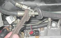 5. Омметром проверяем сопротивление обмоток форсунок, подсоединив один щуп к выводу E ("массе") колодки проводов, а другой - поочередно к четырем выводам (F,G,B,C), измеряя сопротивление каждой форсунки, которое должно быть в пределах 12-14,5 Ом. 6. Снимаем ресивер (см. "Ресивер - снятие и установка"). 7. Ключом на 17 мм отворачиваем штуцер трубки слива топлива из рампы, удерживая наконечник шланга ключом того же размера.