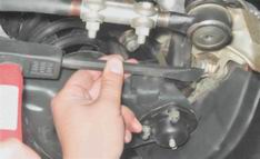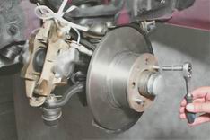 Установка 1. Установку цилиндра и суппорта проводим в обратной последовательности. Внимание! Тормозные цилиндры тормозных механизмов передних колес не взаимозаменяемы. He перепутайте их при установке. 2. Перед установкой нового цилиндра нажимаем на фиксатор и устанавливаем цилиндр в направляющие пазы суппорта. Внимание! При затрудненной установке нового цилиндра в суппорт притупите напильником заходную кромку установочной направляющей цилиндра. 3. Цилиндр запрессовываем до момента срабатывания фиксатора. 4. Заменяем медные уплотнительные шайбы новыми (см. "Шланг тормозного механизма переднего колеса - замена"). 5. После установки суппорта и подсоединения тормозного шланга прокачиваем гидропривод со стороны замененного цилиндра (см. "Гидропривод тормозов - прокачка и замена тормозной жидкости"). Внимание! Тормозные диски заменяем попарно с обеих сторон автомобиля. Периодически проверяйте состояние дисков (см. "Тормозная система - проверка технического состояния") и заменяйте их, не допуская износа до толщины менее 9,5мм, при повышенном боковом биении или в случае глубоких рисок на рабочей поверхности. Снятие 1. Снимаем суппорт (см. выше), не отсоединяя тормозного шланга. Можно снять суппорт, не снимая колодок. Для этого нажимая раздвижными пассатижами через колодки, поочередно утапливаем поршни в цилиндры.