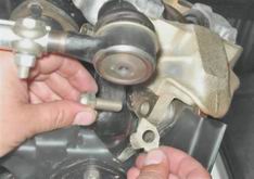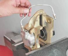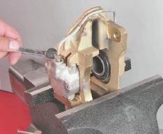 Рабочий цилиндр необходимо заменить при заклинивании поршня или при утечке тормозной жидкости через уплотнительное кольцо. 9. Закрепляем суппорт в тисках. 10. Ключом на 10 мм отворачиваем два штуцера крепления соединительной трубки рабочих цилиндров.