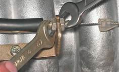 6. Двумя ключами на 13 мм ослабляем затяжку гаек крепления оболочки троса к кронштейну.
