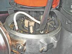 B том случае если угол не совпадает с необходимым - 52-58°, выполняем его регулировку (см. ниже). 8. Снимаем ключ с гайки крепления шкива коленчатого вала. Регулировка 1. Шлицевой отверткой ослабляем винт крепления контактной группы прерывателя.