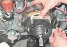 Вакуумный усилитель тормозов - заменаДля выполнения работы потребуется помощник, а также штангенциркуль, специальный ключ на 10 мм для тормозных трубок, прозрачная виниловая трубка подходящего диаметра, емкость для слива тормозной жидкости, свежая тормозная жидкость (см. "Эксплуатационные жидкости"). Снятие 1. Подготавливаем автомобиль к выполнению операций (см. "Подготовка автомобиля к TO и ремонту"). 2. Снимаем главный тормозной цилиндр (см. "Главный тормозной цилиндр - снятие и установка"). 3. Вынимаем из корпуса усилителя обратный клапан со шлангом.
