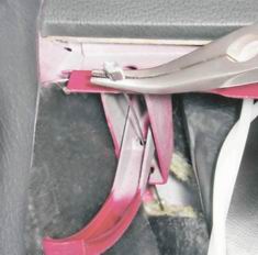 3. Шлицевой отверткой извлекаем из отверстий в кузове два фиксатора оболочки тяги замка (на фото показан один фиксатор).