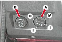 I - один водитель или водитель с пассажиром на переднем сиденье; II - водитель с четырьмя пассажирами; III - водитель с четырьмя пассажирами и грузом в багажнике массой не более 75 кг; IV - один водитель и груз в багажнике массой не более 100 кг. Регулятор освещения приборов В служит для изменения яркости подсветки приборов. При включенном наружном освещении, при вращении регулятора по часовой стрелке - увеличивается яркость подсветки, в обратную сторону - уменьшается. |
