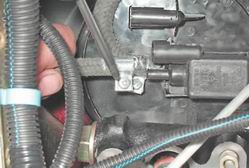 Датчик концентрации кислорода - проверка и заменаВнимание! Датчик установлен в приемной трубе системы выпуска, которая при работе двигателя нагревается до высокой температуры. Во избежание ожогов датчик концентрации кислорода проверяем и снимаем после остывания двигателя до безопасной температуры. Для выполнения работы потребуется вольтметр. Последовательность выполнения 1. Устанавливаем автомобиль на смотровую яму или эстакаду ("Подготовка автомобиля к ТО и ремонту"). 2. В моторном отсеке, отжав пластмассовый фиксатор, отсоединяем колодку жгута проводов от колодки датчика концентрации кислорода.