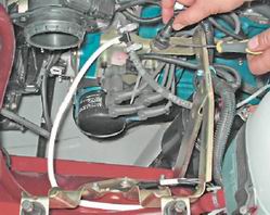 Датчик положения дроссельной заслонки - проверка и заменаДля выполнения работы потребуется мультиметр. Последовательность выполнения 1. Подготавливаем автомобиль к выполнению операции ("Подготовка автомобиля к ТО и ремонту"). 2. Освобождаем фиксатор колодки жгута проводов и отсоединяем колодку от датчика положения дроссельной заслонки.