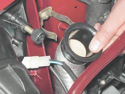 Датчик температуры охлаждающей жидкости - проверка и заменаДля выполнения работы потребуются: мультиметр, термометр (с пределом измерения не менее 100°С), небольшая термостойкая емкость объемом около 0,5 л для воды, около 0,2 л воды, разогретой до температуры кипения. Последовательность выполнения 1. Подготавливаем автомобиль к выполнению операции ("Подготовка автомобиля к ТО и ремонту"). 2. Освобождаем фиксатор колодки жгута проводов и отсоединяем ее от датчика температуры охлаждающей жидкости.