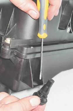 3. Подсоединяем "минусовой" щуп вольтметра к "массе" двигателя. 4. Включив зажигание, вольтметром измеряем напряжение на выводе "А" колодки жгута проводов. Напряжение на выводе должно быть не меньше 12 B. Если напряжение не поступает на колодку, то это указывает на неисправность в цепи питания или ЭБУ. 5. Выключаем зажигание. 6. Ключом на 19 мм отворачиваем датчик температуры и вынимаем его вместе с уплотнительной шайбой из корпуса патрубка системы охлаждения двигателя.