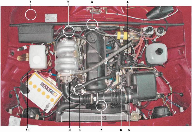 Напряжение должно быть не меньше 12 В. Если напряжение не поступает на колодку или оно меньше 12 В, - неисправность в цепи питания, разрядилась аккумуляторная батарея или неисправен ЭБУ. 4. Выключаем зажигание. 5. Снимаем корпус воздушного фильтра ("Корпус воздушного фильтра - снятие и установка"). 6. Очищаем катушку от грязи. 7. Отсоединяем наконечники высоковольтных проводов от катушки зажигания.