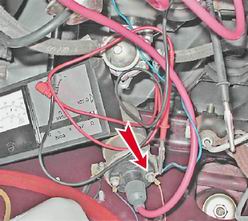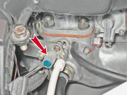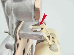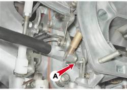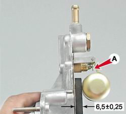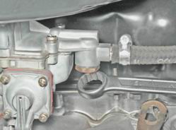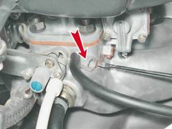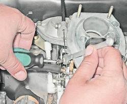 23. Снимаем микропереключатель с кронштейном и экономайзер ("Экономайзер принудительного холостого хода (ЭПХХ) - проверка и замена"). 24. Шлицевой отверткой выворачиваем и извлекаем винт качества с резиновым уплотнительным кольцом. Для удобства последующей установки запоминаем количество оборотов винта. Примечание Если на винте установлена ограничительная втулка, шлицевой отверткой проворачиваем втулку до разрушения и извлекаем ее части из отверстия.