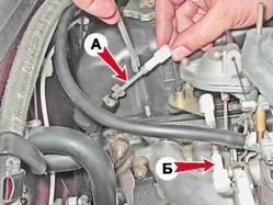 8. Плоскогубцами извлекаем малые диффузоры первичной Б и вторичной А камер. Маркировка диффузора первичной камеры - 3,5 (35), вторичной - 4,5 (45). Если диффузоры не извлекаются после снятия корпуса дроссельных заслонок (см. ниже) выбиваем их с противоположной стороны выколоткой из мягкого металла.