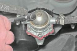 11. Проверяем исправность диафрагмы пускового устройства. Утопив шток, закрываем пальцем отверстие подвода разрежения и отпускаем шток. Если шток не возвращается в исходное положение, - диафрагма исправна. В противном случае диафрагму необходимо заменить. 12. Для замены диафрагмы крестовой отверткой отворачиваем три винта, крепящих крышку пускового устройства к его корпусу.