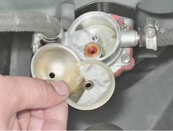Между корпусом и крышкой карбюратора установлена уплотнительная прокладка. При наличии изломов и разрывов заменяем прокладку. 8. Для замены прокладки необходимо снять игольчатый клапан (см. выше, "Игольчатый клапан и поплавок - замена").