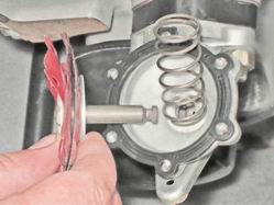 14. Проверяем состояние диафрагмы, разрывы и трещины не допускаются. При необходимости заменяем диафрагму. Установка 1. Перед сборкой и установкой крышки промываем все ее детали очистителем карбюратора. 2. Резиновой грушей отбираем топливо из поплавковой камеры корпуса карбюратора. Промываем очистителем карбюратора внутреннюю поверхность корпуса карбюратора и диффузоры камер. Вывернув топливные и воздушные жиклеры и ускорительный насос (см. ниже, "Корпус карбюратора - разборка"), продуваем каналы корпуса сжатым воздухом.