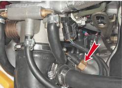 10. Отстегнув ремень крепления расширительного бачка и приподняв его, сливаем жидкость из бачка через радиатор. 11. Устанавливаем бачок на место и закрепляем его ремнем. 12. Заворачиваем пробки сливных отверстий на радиаторе и блоке цилиндров. Примечание Чтобы не возникло воздушных пробок, рекомендуется снять резиновый шланг с патрубка узла подогрева впускного трубопровода (корпуса дроссельной заслонки на впрысковом двигателе). При заполнении системы в момент выхода жидкости из шланга надеваем его на патрубок.