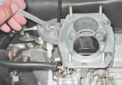 3. Отсоединяем пневмопривод от корпуса. Между корпусом карбюратора и пневмоприводом установлена уплотнительная прокладка. Проверяем состояние прокладки и при необходимости заменяем ее.