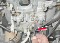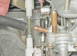 Пневмопривод дроссельной заслонки - снятие и установкаСнять пневмопривод можно без снятия карбюратора с автомобиля. Для этого достаточно снять корпус воздушного фильтра ("Корпус воздушного фильтра - снятие и установка"). Для наглядности работа показана на снятом карбюраторе. Снятие 1. Сдвинув шлицевой отверткой, снимаем стопорную шайбу и затем тягу пневмопривода с оси рычага дроссельной заслонки.