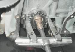 5. Домкратом, установленным под картер сцепления, через проставку приподнимаем силовой агрегат и выводим шпильки опор из поперечины. Подвешиваем силовой агрегат к деревянному брусу, расположив его на передних крыльях автомобиля.