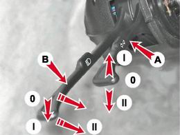 Положения подрулевого переключателя указателей поворота А: 0 - указатели поворота выключены; I - включены указатели правого поворота; II - включены указатели левого поворота. Положения подрулевого переключателя света фар при третьем фиксированном положении выключателя В наружного освещения. Ключ в замке зажигания находится в положении "Зажигание" или "Стоянка": 0 - включено наружное освещение и ближний свет фар; I - включено наружное освещение и дальний свет фар; II - включен дальний свет фар (нефиксированное положение).