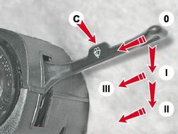 Положения подрулевого переключателя стеклоочистителя С: 0 - стеклоочиститель ветрового стекла выключен; I - стеклоочиститель ветрового стекла работает в прерывистом режиме; II - стеклоочиститель ветрового стекла работает непрерывно; III - включается омыватель ветрового стекла, а при включенном свете фар одновременно включаются стеклоочистители и омыватели блок-фар. |