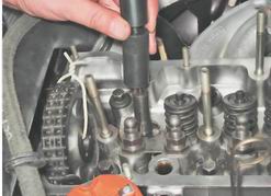 Прокладка головки блока цилиндров впрыскового двигателя - заменаГоловку блока цилиндров снимаем, не отсоединяя ресивера, впускного трубопровода и выпускного коллектора. Для выполнения работы потребуется динамометрический ключ. Снятие 1. Устанавливаем автомобиль на смотровую яму или эстакаду ("Подготовка автомобиля к ТО и ремонту"). 2. Для удобства проведения работы снимаем аккумуляторную батарею ("Аккумуляторная батарея - снятие и установка"). 3. Сливаем охлаждающую жидкость ("Охлаждающая жидкость - проверка уровня и замена"). 4. Отсоединяем наконечник провода от датчика указателя температуры охлаждающей жидкости ("Датчик указателя температуры охлаждающей жидкости - замена"). 5. Выворачиваем из головки блока цилиндров свечи зажигания ("Свечи зажигания - проверка состояния и замена"). 6. Снимаем приемную трубу со шпилек выпускного коллектора ("Приемная труба - снятие и установка"). 7. Устанавливаем поршень 4-го цилиндра в положение ВМТ такта сжатия и снимаем корпус в сборе с распределительным валом, рычаги приводов клапанов и пружины ("Распределительный вал и рычаги клапанов - замена"). 8. Подвязываем проволокой цепь и пропускаем через окно в головке блока цилиндров.