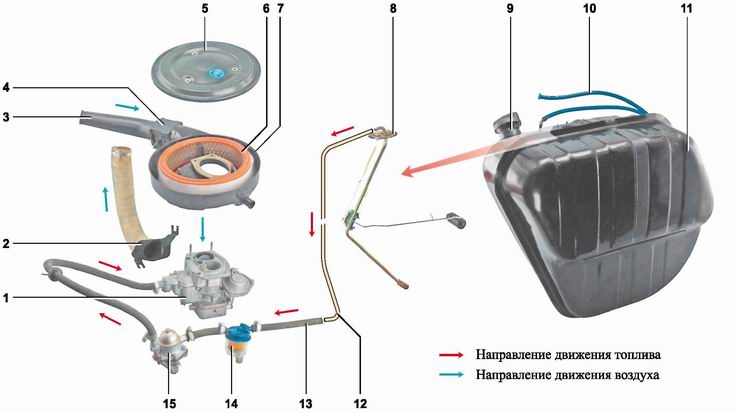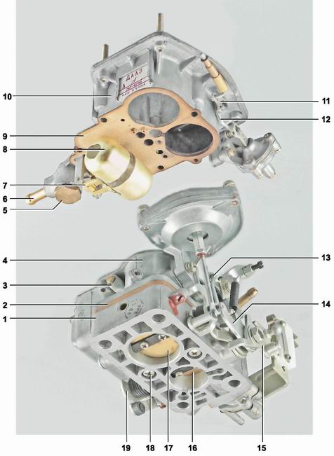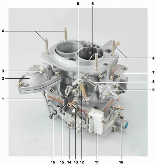 Величина зазора Б должна быть в пределах 0,7-0,8 мм. 10. Зазор регулируем перестановкой в другое отверстие наконечника тяги В приводов воздушной и дроссельной заслонок или подгибанием тяги. 11. Установка всех снятых деталей выполняется в обратной последовательности. |