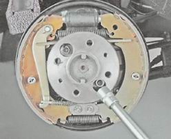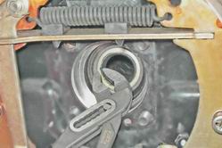 8. Перед разборкой боковой тяги измеряем и записываем ее длину. Это необходимо для того, чтобы при сборке не нарушить правильную величину схождения колес. Ослабляем болты стяжных хомутов соединительной муфты и вывинчиваем наконечники. Аналогично снимаем и разбираем другую боковую тягу. 9. Для снятия средней рулевой тяги расшплинтовываем и торцовым ключом на 22 мм с удлинителем из моторного отсека отворачиваем гайки. 10. Если пальцы шарниров боковых тяг отсоединены от маятникового рычага и сошки редуктора рулевого механизма, то при помощи съемника выпрессовываем пальцы шаровых шарниров тяги и снимаем ее.