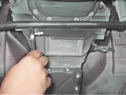 Сальник ведущей шестерни главной передачи - заменаДля выполнения работы потребуются двухзахватный съемник и динамометрический ключ. Сальник заменяем новым при обнаружении утечек масла из-под хвостовика ведущей шестерни. Это визуально определяется наличием капель масла на внешней поверхности редуктора. Следует иметь в виду, что если картер редуктора покрыт лишь тонкой пленкой масла без образования капель (так называемое масляное отпотевание), то это не является поводом для замены сальника. Внимание! Неквалифицированные действия при замене сальника могут привести к необходимости разборки и ремонта редуктора заднего моста, что осуществимо только в условиях специализированной мастерской. Снятие 1. Устанавливаем автомобиль на смотровую яму или эстакаду ("Подготовка автомобиля к ТО и ремонту"). 2. Сливаем масло из заднего моста ("Задний мост - проверка уровня и замена масла"). 3. Отсоединяем карданный вал от фланца ведущей шестерни ("Карданная передача - снятие и установка"). 4. Включаем стояночный тормоз. 5. Торцовым ключом на 24 мм отворачиваем гайку крепления фланца хвостовика.