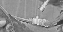 12. Аналогично отсоединяем ветвь троса с противоположной стороны и снимаем задний трос привода стояночной тормозной системы. Внимание! Правая ветвь троса отличается от левой наличием на оболочке резиновой трубки. Направляющий ролик переднего троса снимаем при наличии механических повреждений или для смазки контактных поверхностей ролика и распорной втулки. Снятие ролика 1. Снимаем направляющую заднего троса с наконечника переднего и отсоединяем ее от троса (см. выше). 2. Ключом на 13 мм отворачиваем болт крепления ролика.
