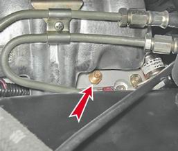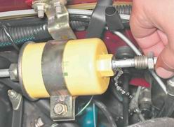 8. Торцовым ключом на 10 мм отворачиваем болт хомута крепления топливного бака.