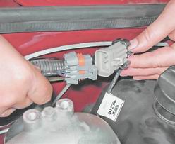 3. В моторном отсеке тонкими плоскогубцами или отверткой снимаем пружинный фиксатор с сектора привода дроссельной заслонки.