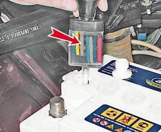 6. Поочередно проверяем плотность во всех аккумуляторах батареи. 7. При падении плотности до значения менее 1,24 г/см³, снимаем батарею с автомобиля (см. "Аккумуляторная батарея - снятие и установка") и заряжаем ее. |