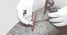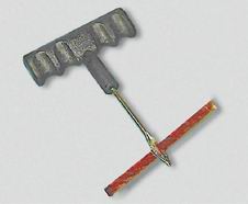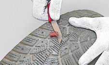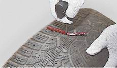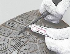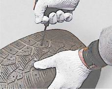 1 - приспособление с резьбовым наконечником или с насечками; 2 - полоски сырой резины; 3 - игла с разъемным ушком; 4 - клей-активатор для сырой резины Предупреждение! Шину с проколом большого размера, повреждением корда или с порезом боковины необходимо заменить. Ремонт шины возможен без снятия колеса, достаточно поддомкратить автомобиль и установить на опору. Эксплуатация автомобиля допускается сразу после ремонта. Предупреждение! При движении на отремонтированной шине следует соблюдать осторожность: снизить скорость движения, чтобы при внезапном разрушении шины иметь возможность принять адекватные меры; стараться объезжать неровности дороги, или проезжать их на малой скорости. При первой возможности отремонтированную шину необходимо заменить. Допустимо использовать такую шину на запасном колесе. Последовательность выполнения 1. Находим место прокола (по выходящему из прокола воздуху или по предмету, пробившему шину).