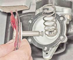 5. Нажимаем на тарелку диафрагменного узла и, поворачивая шток на 90°, выводим его из зацепления с вилкой балансира. Вынимаем шток с диафрагменным узлом из отверстия корпуса и снимаем пружину.