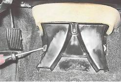 6. Снимаем со шпильки наконечник "массового" провода. 7. Крестовой отверткой отворачиваем два самореза крепления нижнего воздуховода, расположенного на туннеле пола.