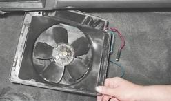 Электродвигатель вентилятора отопителя - заменаСнятие 1. Подготавливаем автомобиль к выполнению работы (см. "Подготовка автомобиля к TO и ремонту"). 2. Снимаем щиток приборов (см. "Щиток приборов - снятие и установка"). 3. Снимаем вещевую полку и панель радиоприемника (см. "Панель приборов - снятие и установка"). 4. Отсоединяем провода от переключателя режимов работы вентилятора отопителя (см. "Панель приборов - снятие и установка"). 5. Торцовым ключом на 10 мм отворачиваем гайку крепления кожуха радиатора и наконечника "массового" провода вентилятора, расположенных за щитком приборов.
