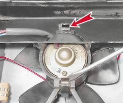 9. Шлицевой отверткой поддеваем и отсоединяем четыре пружинные скобы крепления кожухов вентилятора к кожуху радиатора.