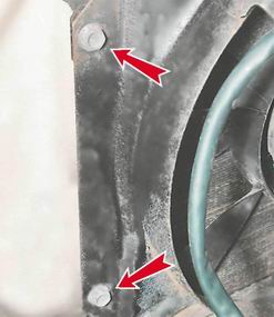 2. Отсоединяем наконечники проводов от датчика включения электровентилятора (см. "Датчик включения электровентилятора - замена"). 3. Торцовым ключом на 10 мм отворачиваем два болта крепления кожуха к радиатору с левой стороны и один - с правой.