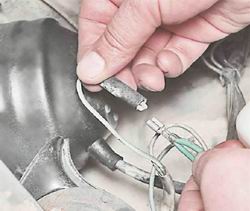 9. Для снятия наружной фары в моторном отсеке, сдвинув кембрики, отсоединяем два наконечника проводов фары от жгута. Для снятия внутренней фары, отсоединяем провод наружной фары и отсоединяем провод фары от жгута.