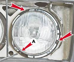 10. Крестовой отверткой отворачиваем три самореза крепления фары. Под саморезом А закреплен "массовый" провод.